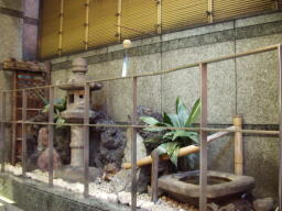 石灯籠にししおどし。簾<すだれ>に風鈴。竹垣もいい色に煤けてます。